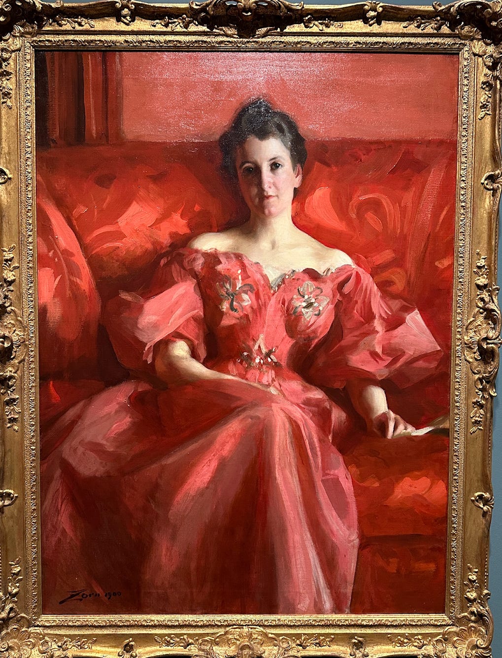 She sits on a red couch, in a red dress, surrounded by that same atmosphere of red, and yet she doesn’t disappear into it. She emerges from it. Her presence commands the frame. The softness of the fabric, the subtle sheen on the silk, the warmth of the background, Zorn turns all of it into a celebration of her beauty, her sensuality, her dignity. It is sensual without being crude, elegant without being cold, vivid without being gaudy. It lives. It’s one of the most visually striking portraits I have recently seen, and you could feel people around the room pausing longer there, as if the painting were almost pulling them in.