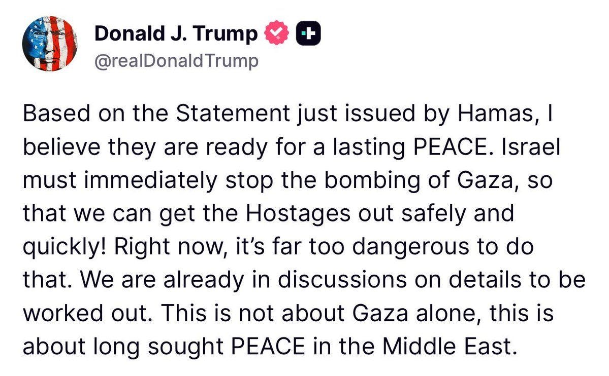 “I support your plan to end the war in Gaza, which achieves our war aims. It will bring back to Israel all our hostages, dismantle Hamas’s military capabilities, end its political rule, and ensure that Gaza never again poses a threat to Israel.”